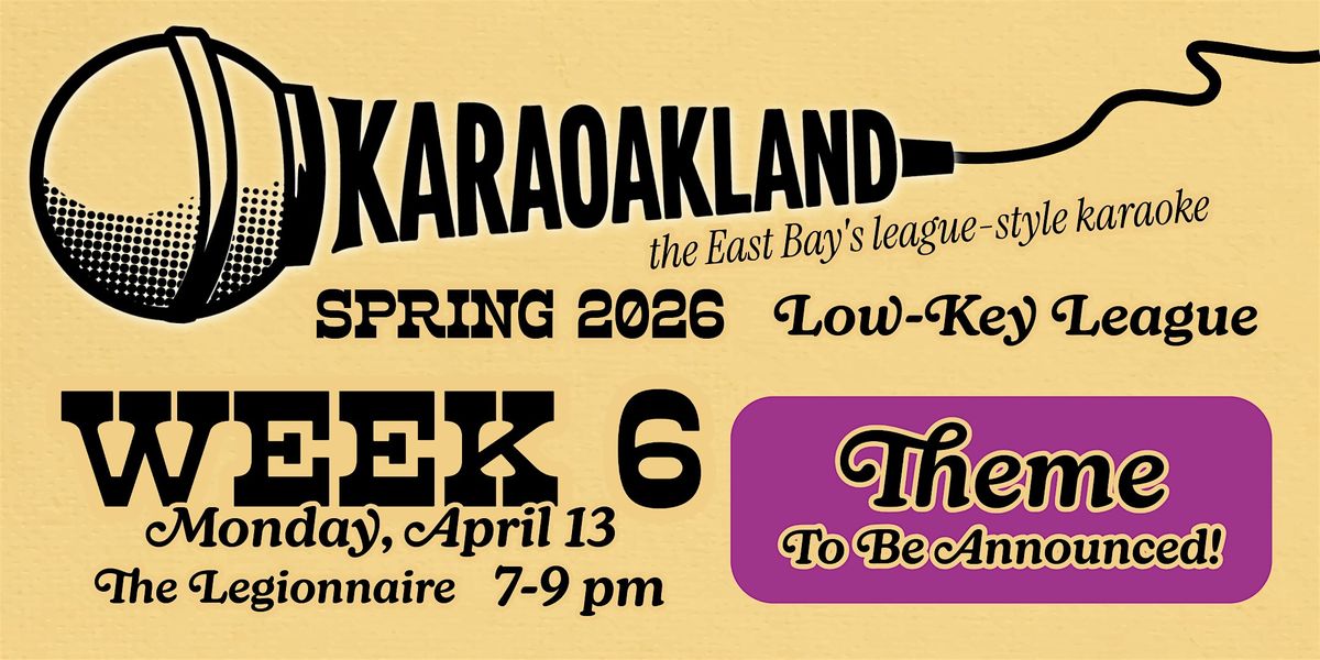 🎠KaraOakland Low-Key League Week 6: THEME TO BE ANNOUNCED • April 13th • The Legionnaire, Oakland • League Play 7–9 PM • Open Karaoke After 9 PM • Free to attend • 21+