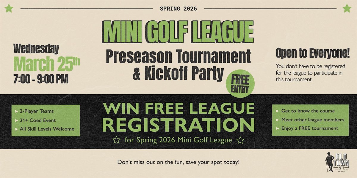 Kick off the Spring 2026 Mini Golf League with an epic preseason tournament and party at Old Town Putt! Whether you’re gearing up for league play or just want a fun night out, this event is open to everyone—yes, even non-league players.