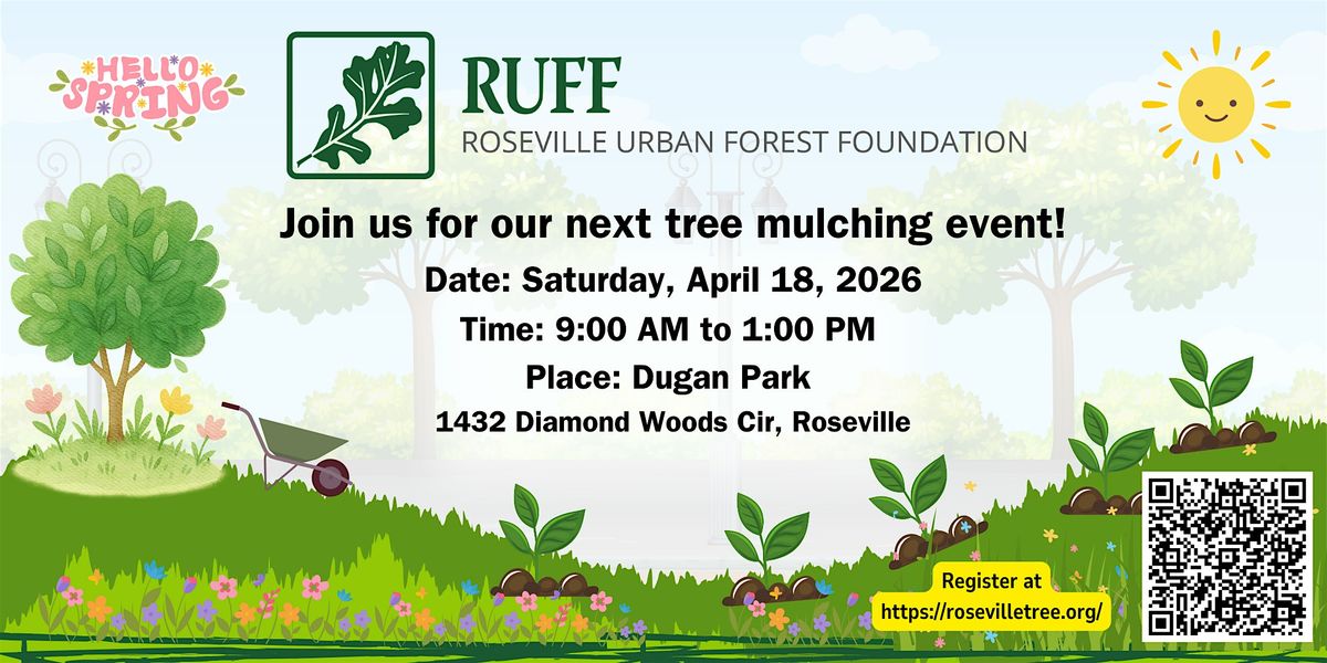 This event runs from 9:00 AM to 1:00 PM at Dugan Park (1432 Diamond Woods Circle, Roseville). We’ll also host additional mulching events this summer — visit our website for updates: RUFF Website