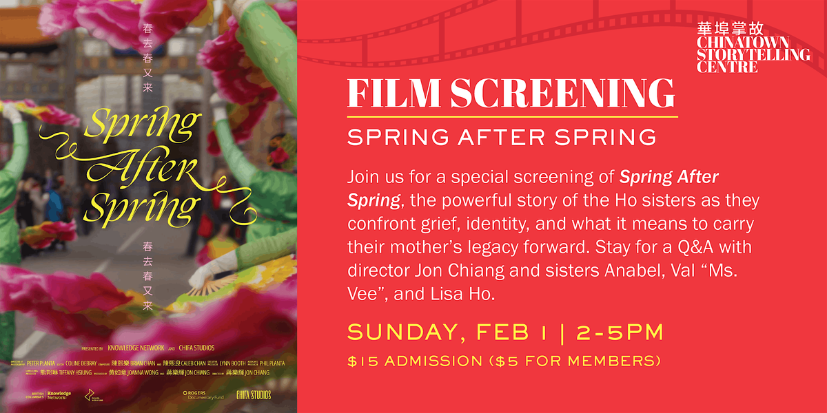 Join us for a community screening of Jon Chiang’s Spring After Spring at the Chinatown Storytelling Centre. Winner of Best Canadian Feature at the Vancouver Asian Film Festival, the film follows the Ho sisters as they reunite each Lunar New Year to lead Vancouver’s Chinatown Parade. After their mother, Maria “Mimie” Ho, founder of the Strathcona Chinese Dance Company, passed away, her loss left a void in both the community and their lives. As they reunite, the sisters confront grief, identity, and what it means to carry her legacy forward.