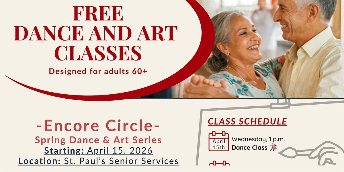 Join us for free Dance & Art Classes designed for adults 60+, part of the Encore Circle community focused on connection, creativity, and well-being Enjoy a fun and relaxed experience. Move, create, and meet new friends in a welcoming environment, at The Manor at St. Paul's Senior Services on Bankers Hill! Starting on April 15, 2026 at 1:00 PM PDT.