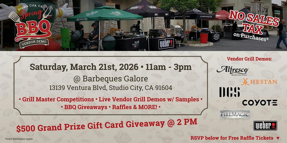 will be hosting a Spring Barbecue Cook-Off & No Sales Tax Sales Event* Sat. March 21, 2026 from the times of 11 AM to 3 PM at our Barbeques Galore Studio City Location. The event will feature food samples, giveaways, grill and grilling demos, and free admission!. Local attendees, presenters, and more! $500.00 grand price gift card giveaway at 2pm. ENTRANCE IS FREE!