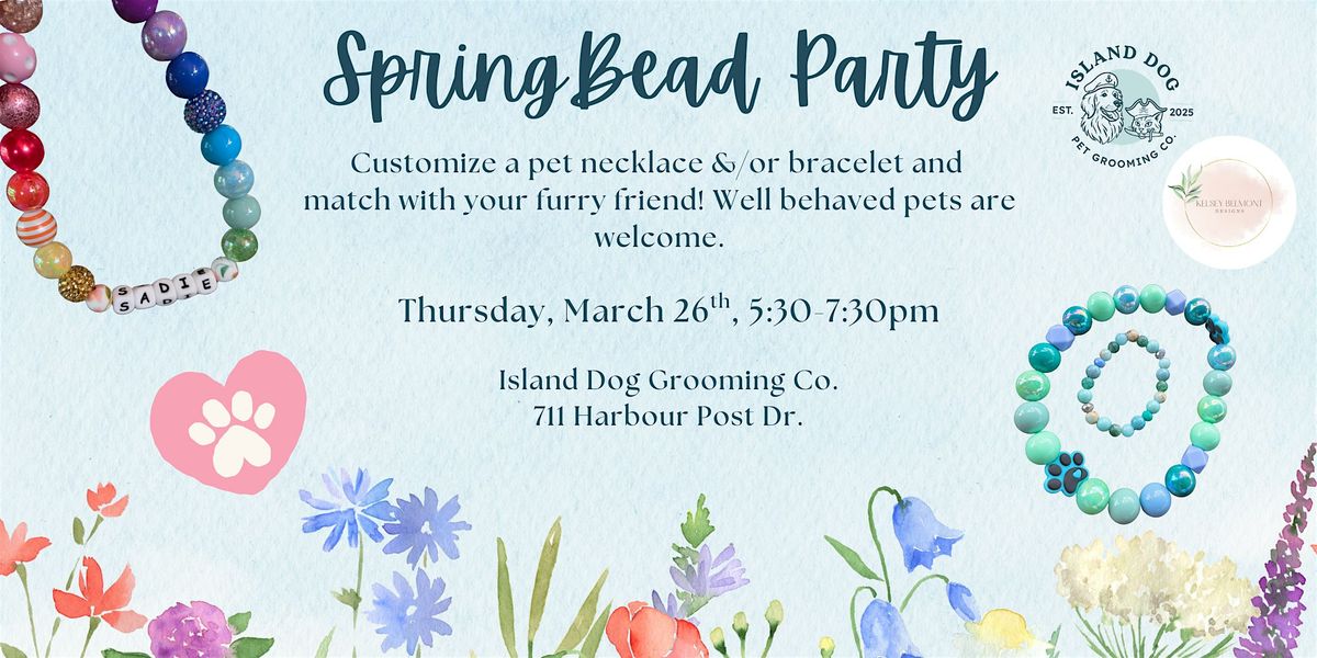 Get ready for a fun Spring Bead Party at Island Dog Pet Grooming Co.! Join us for bracelet making and pet necklace making so you and your furry friend can match! You will have 1000's of beads and accents to choose from to create your own customized pieces! Come for the bracelets, the necklaces, or both! There is something for everyone. Well behaved pets are welcome to join in on the fun.