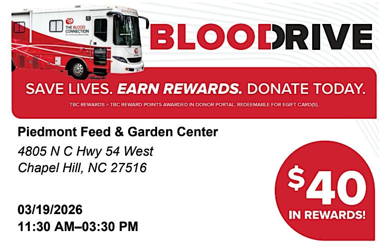 All donors will receive a $15 Piedmont Feed & Garden Center Gift Certificate and $40 in Donor Rewards!