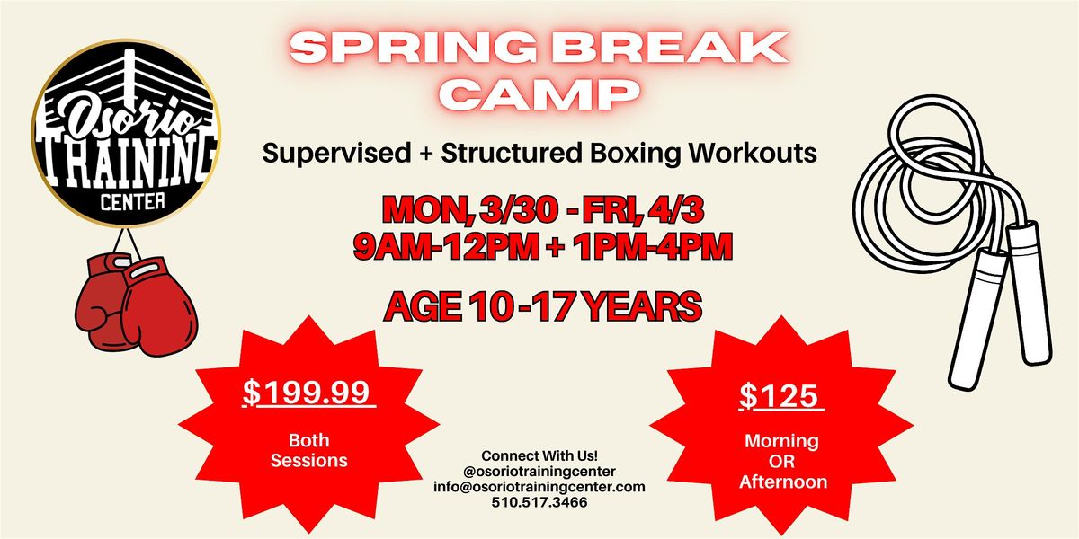 Get ready to punch up your Spring Break! Join us for an awesome in-person boxing camp for youth 10-17 years old where you’ll learn cool techniques, boost your fitness, and have a blast with friends. Whether you're a newbie or have some experience, this camp is perfect to sharpen your skills and get active. Don’t miss out on making this spring break memorable and full of energy!