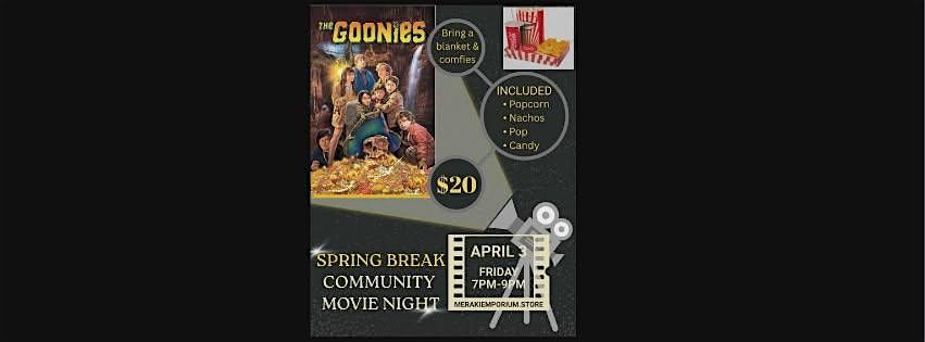 Get ready for a fun-filled evening at our Spring Break Community Movie Night! Join friends and neighbors for an in-person movie experience in our stores event area. We will be using a movie projector to veiw our movies, similar to how the big screen began. Bring your blankets, comfies, and good vibes to enjoy a great film together., The Goonies! It’s the perfect way to kick back, relax, and celebrate spring with the community. Don’t miss out on this awesome night of entertainment and connection!