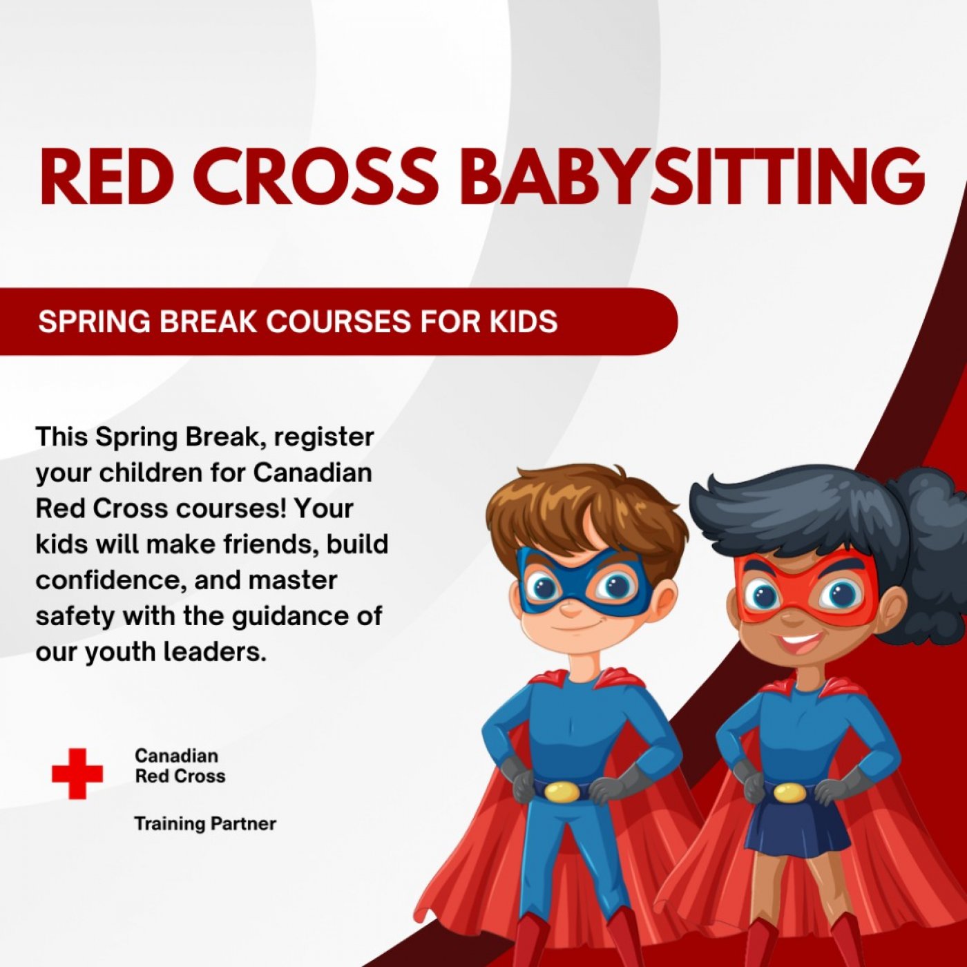The Babysitting course, refreshed and revised, now has a greater emphasis on First Aid skills. The Canadian Red Cross Babysitting course covers everything from managing difficult behaviours to essential content on leadership and professional conduct as a babysitter. Babysitting promises to deepen and enhance the responsibility that older youth feel when caring for younger children. This updated curriculum, complete with new science, also provides improved learning when it comes to giving the appropriate care in the event of an emergency.