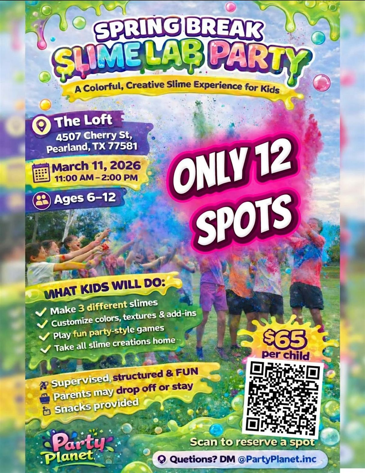 Kids will make 3 slimes, customize colors & textures, play games, enjoy snacks, and take all creations home. Only 12 spots