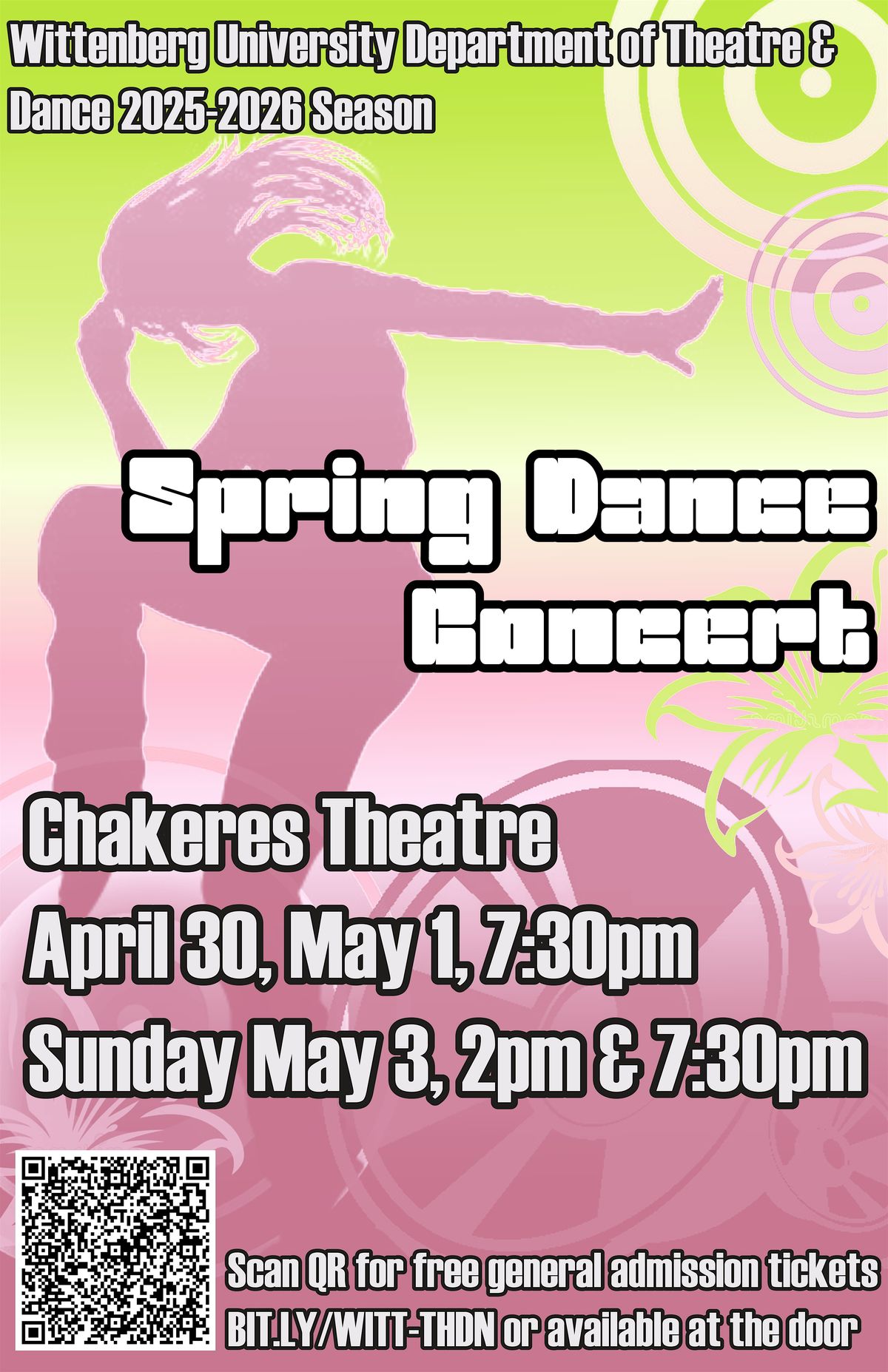 The Department of Theatre and Dance invites you to our annual Spring Dance Concert event choreographed by our Wittenberg seniors! This production features a wide variety of dance styles from contemporary and tap to hip-hop!