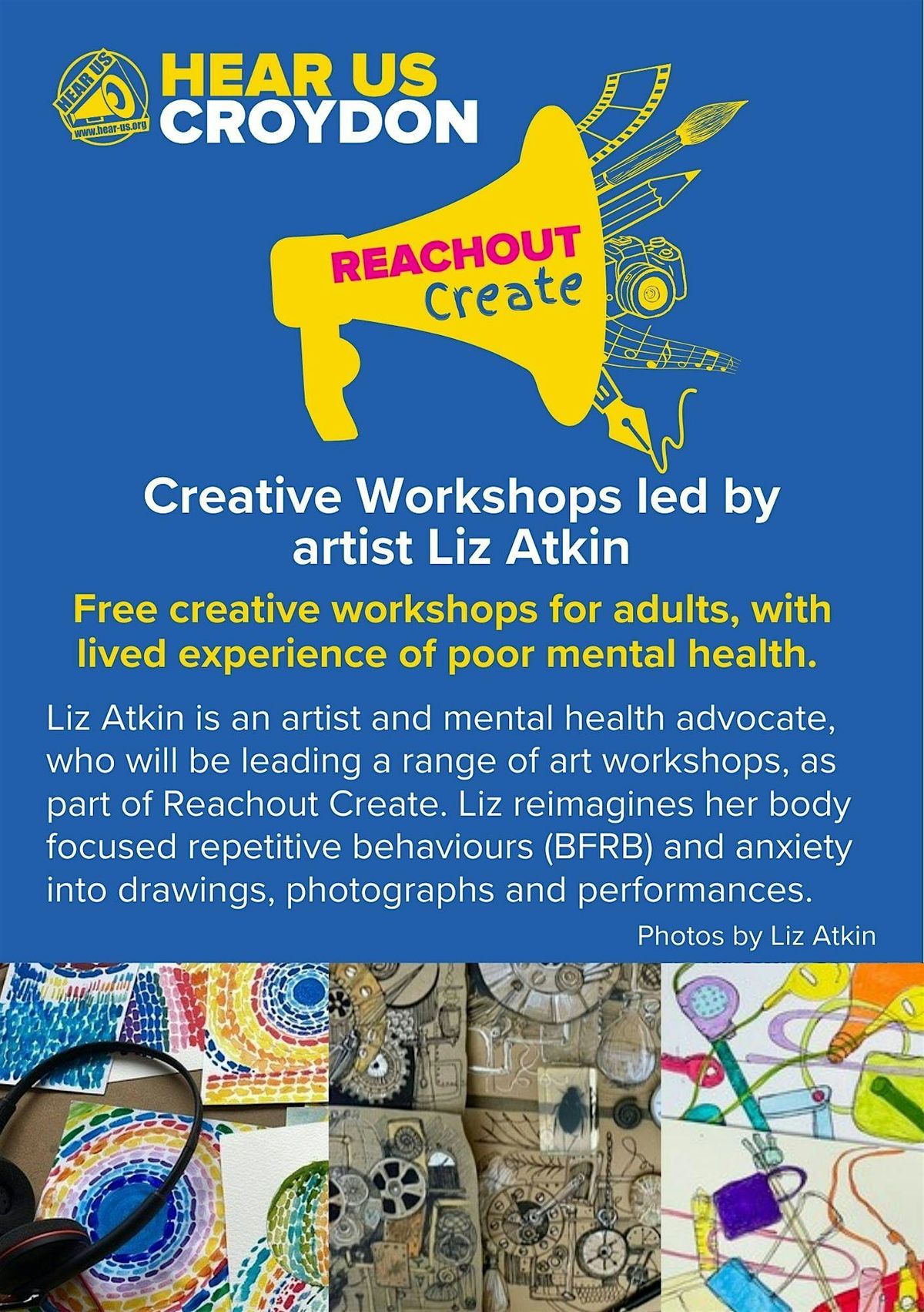Hear Us is Croydon’s Mental Health service user group. We are your voice in mental health. Our purpose is to promote, educate, communicate and empower, for the benefit of people affected by mental health issues. Our organisation is 100% service user run. We have lauched Reachout Create, providing creative workshops led by lived experience artists. We run a range of other projects including peer support, welfare and benefit advice, campaigning and an Open Forum. To find out more about what we do, visit our website.