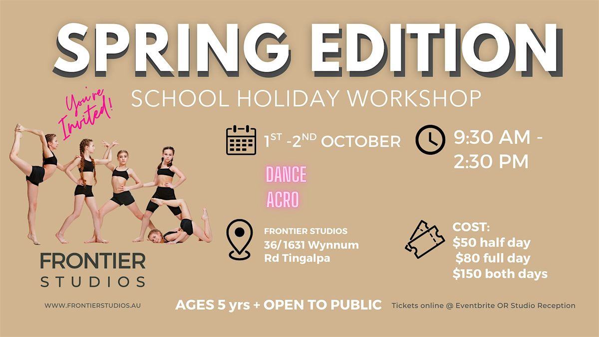 Frontier Studios – Spring Holiday Workshop 🌟Join us for two exciting days of dance, acrobatics, and fun at Frontier Studios! Perfect for kids and teens who love to move, explore new styles, and make friends.