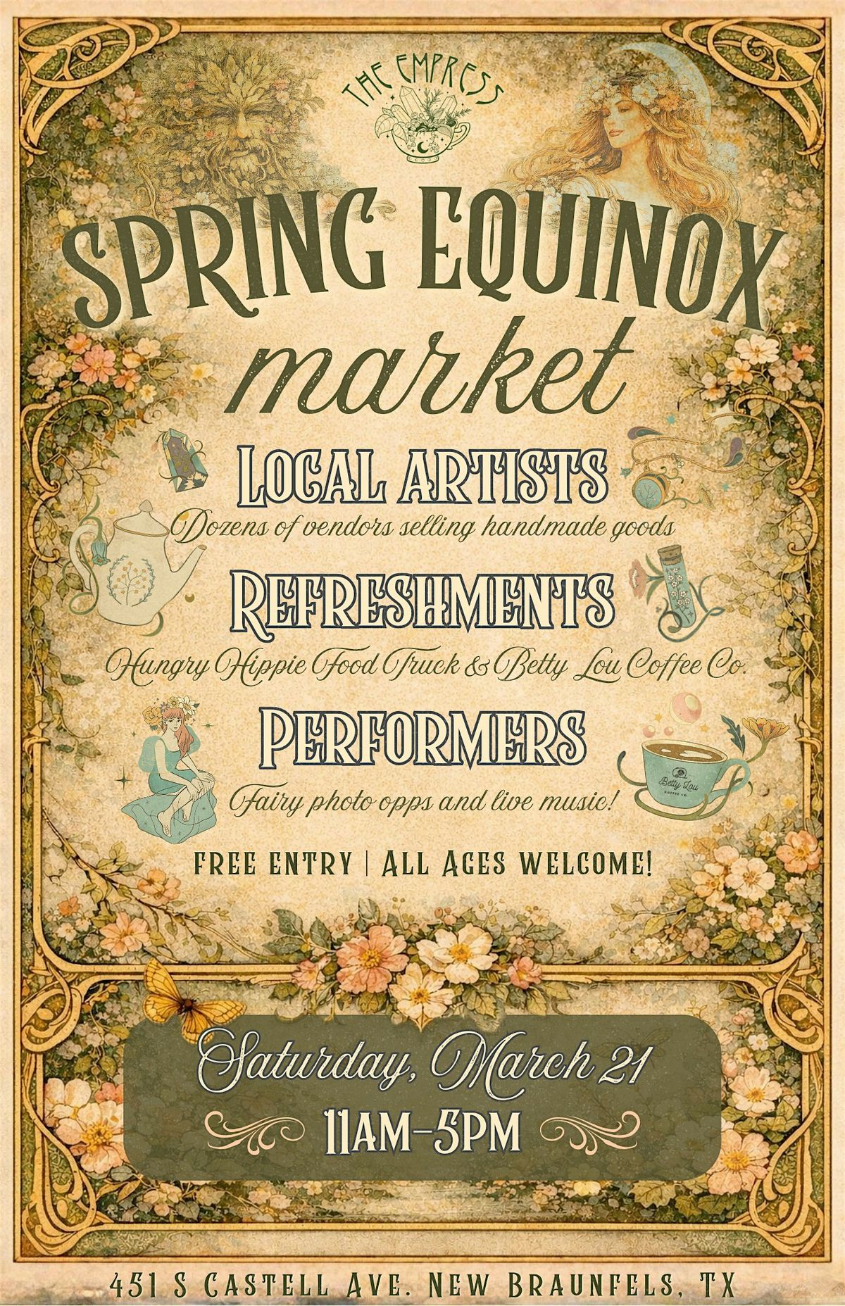 The Empress will be open all day for magical shopping inside the shop, and guests of all ages are warmly invited to dress in whimsical spring attire — fairies, florals, mushrooms, and enchanted beings encouraged. Come welcome the season with community, creativity, and a little enchantment.