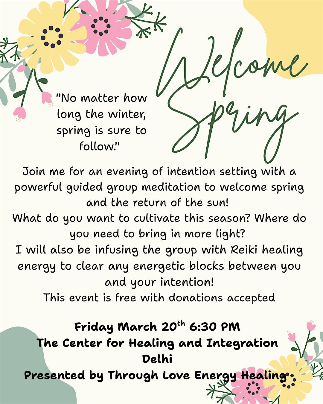 Join me for an evening of intention setting and a powerful group meditation to welcome in spring! We will begin right about sunset, the midpoint of the midpoint, with a meditation designed to help you set fresh intentions for the beginning of the season of growth and renewal! I will also bring reiki healing energy to clear away anything still clinging to our energy that's ready to be released.