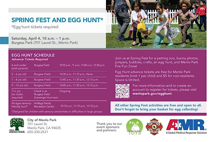 Join us at Spring Fest for a petting zoo, bunny photos, jumpers, bubbles, crafts, an egg hunt, and Menlo Park Fire Fun Zone! Egg Hunt advance tickets are free for Menlo Park residents (limit 1 per child) and $5 for non-residents. Space is limited. For more information and to create an account to register for tickets, please visit menlopark.gov/egghunt City of Menlo Park 701 Laurel St. Menlo Park, CA 94025 650-330-2531 Thank you to our event sponsors.