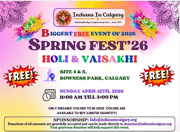 Join us for Spring Fest: Holi & Vaisakhi 2026, a lively and family-friendly celebration that brings together Calgarians from all walks of life to experience the vibrancy of two cherished spring festivals!