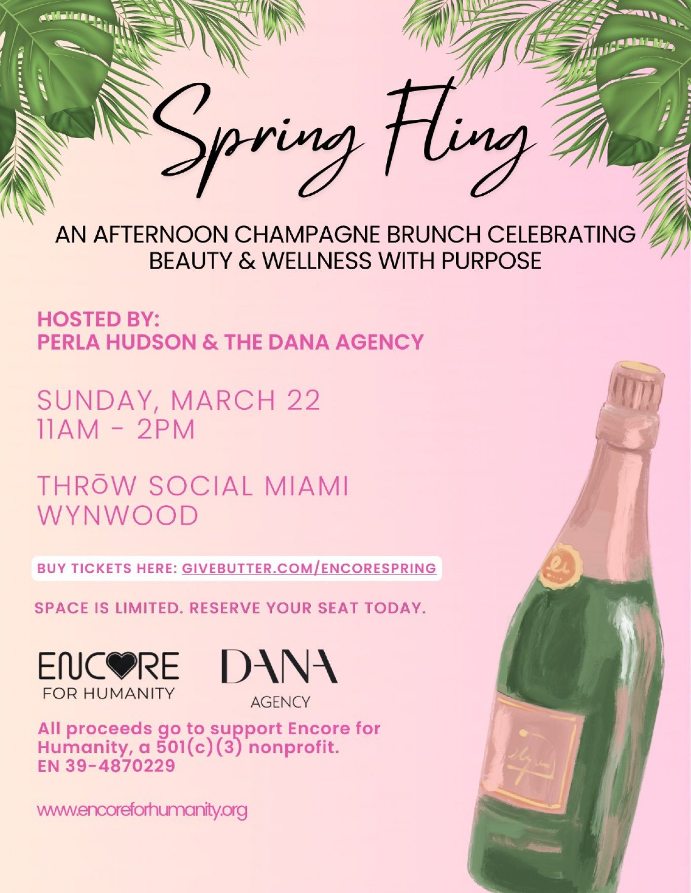 Celebrate the arrival of spring with a Sunday gathering that brings together beauty, wellness and giving back. The Spring Fling Beauty & Wellness Champagne Brunch, co-hosted with Perla Hudson in support of her nonprofit Encore for Humanity, invites guests to enjoy a thoughtful morning in Wynwood.