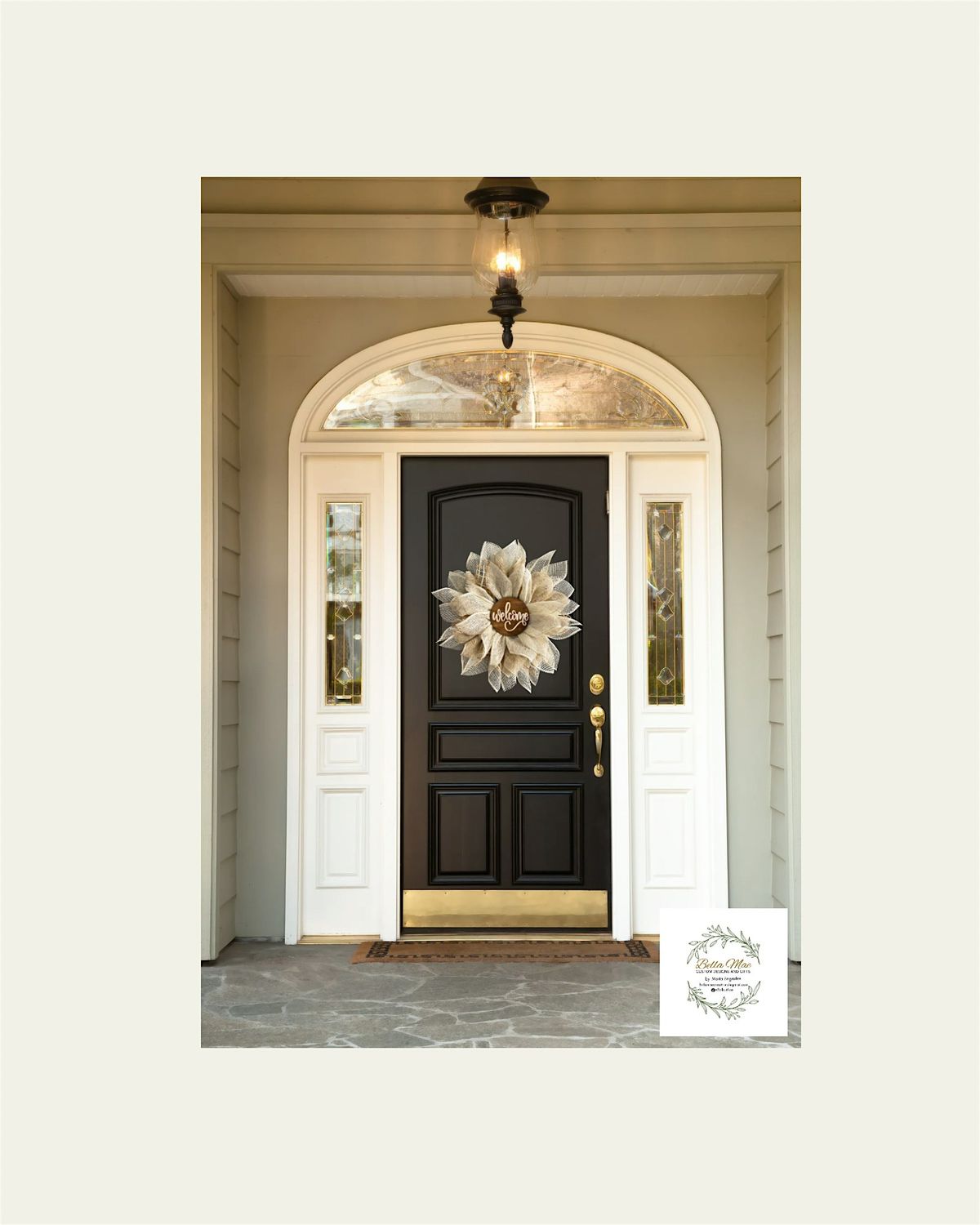 This handcrafted large 22" burlap wreath features a beautifully layered burlap flower and a classic 6" wood centerpiece adorned with your INITIAL or WELCOME. This textured look captures the charm of early spring farmhouse style. The natural burlap tones create a light and inviting design that feels warm, welcoming, and perfect for the transition from winter into spring.