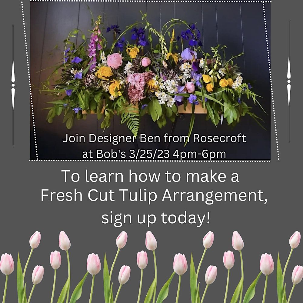 Our special guest, Ben from Rosecroft, will be guiding you through a floral arrangement with an array of tulips, pussy willow, and other spring branches.