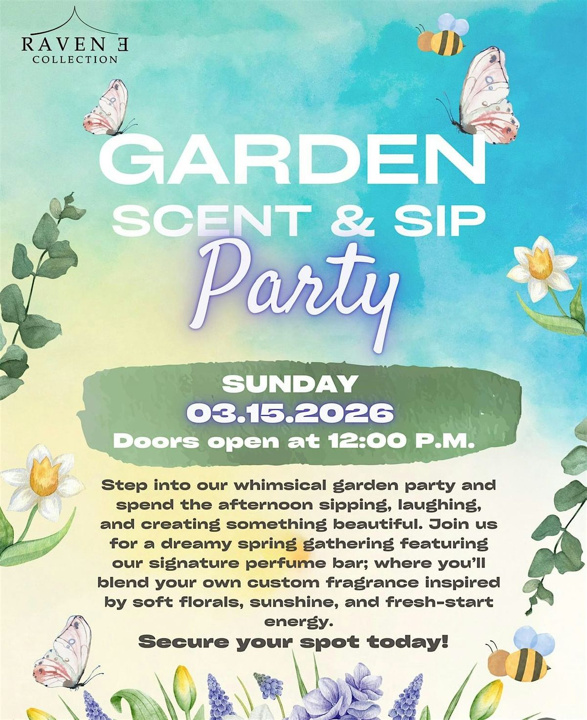 Join Raven E Collection for a luxurious afternoon! Step into our whimsical garden party and spend the afternoon sipping, laughing, and creating something beautiful. Join us for a dreamy spring gathering featuring our signature perfume bar; where you’ll blend your own custom fragrance inspired by soft florals, sunshine, and fresh-start energy.