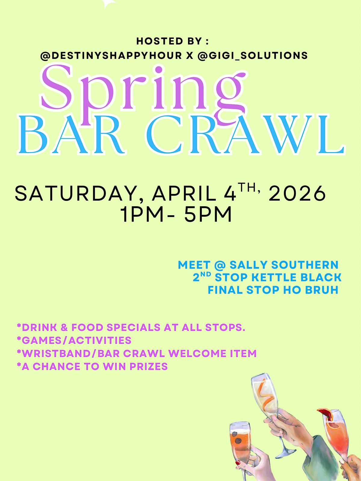 The weather is warming up ! I hope you're ready for a fun-filled Saturday with the coolest crew! Purchasing a ticket to The Spring Interactive Bar Crawl grants access to meet new people, hang with others you know, and enjoy drink & food specials from each stop along the way. We'll start at Sally's Southern, where guest will check in- and get their wrist bands. We'll move as a group, to the other bars, which are 1 min walking distance. This gives ample oppurtunity for people to enjoy day drinking, and NOT DRIVING ! With games, activities, and prizes at each stop, lots of fun memories will be created. Don't miss out on this interactive and lively day of events. Guest are encouraged to wear pastel colors. See you there !