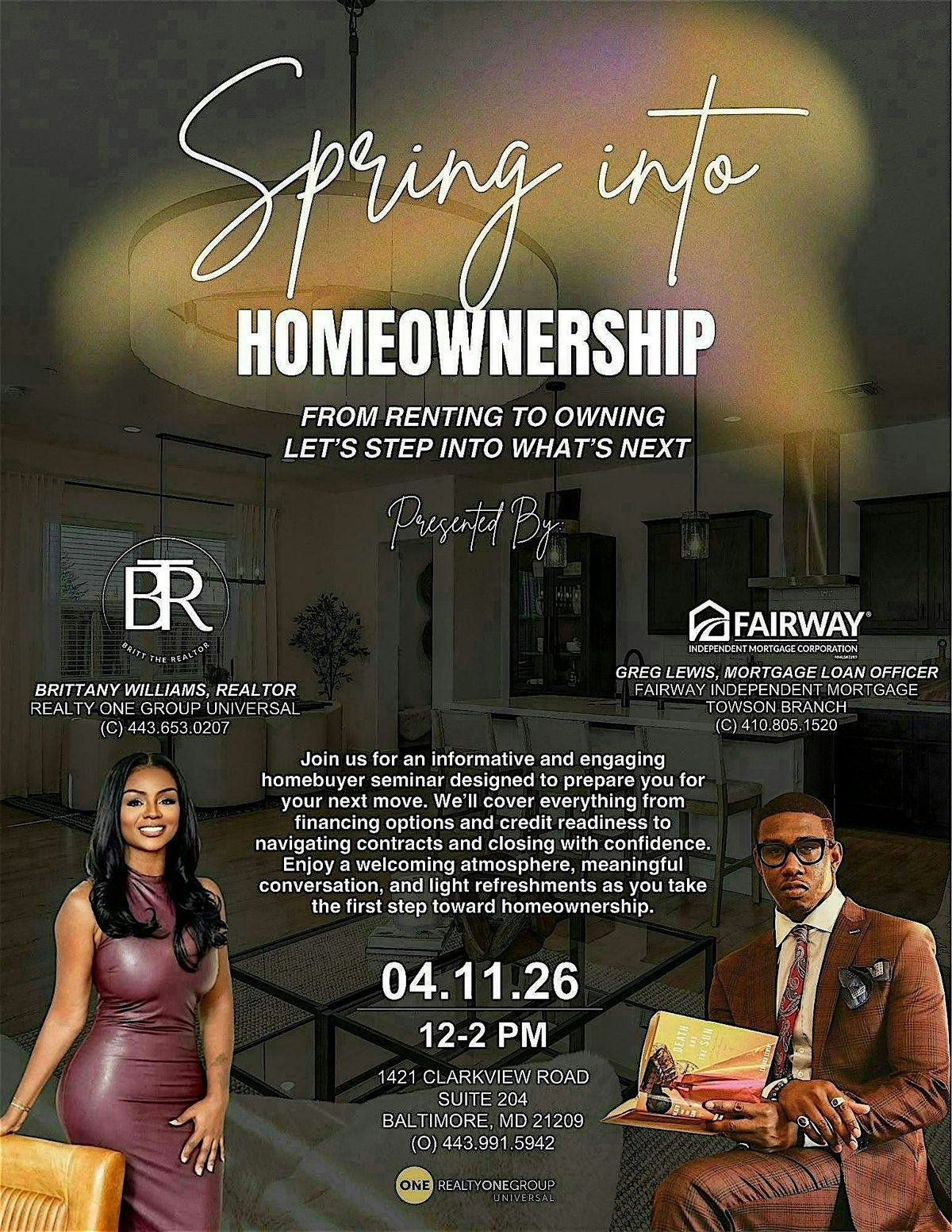 Join us for an informative and engaging homebuyer seminar designed to prepare you for your next move. We'll cover everything from financing options and credit readiness to navigating contracts and closing with confidence. Enjoy a welcoming atmosphere, meaningful conversation, and light refreshments as you take the first step toward homeownership.