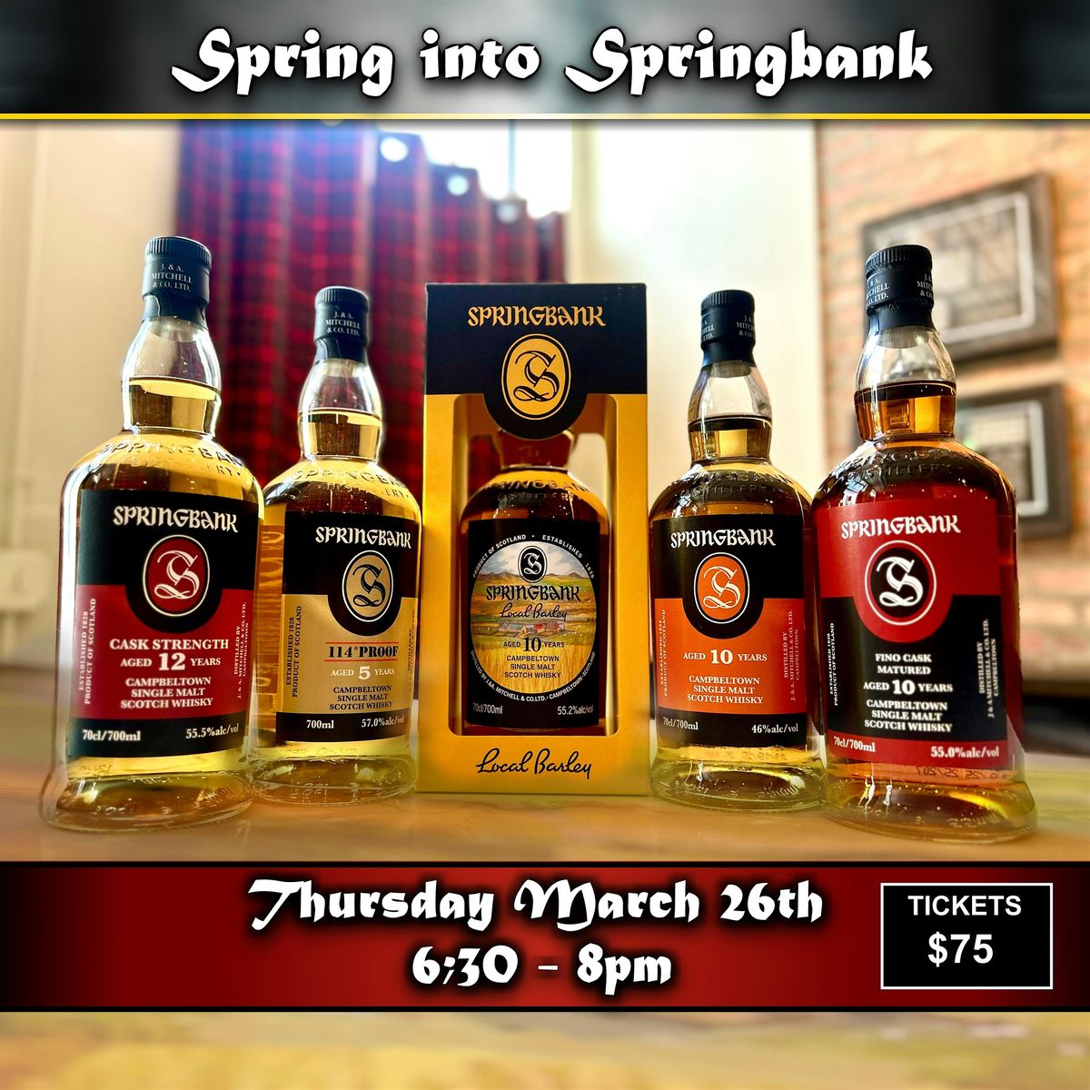 Join us for our first tasting of spring as we fittingly dive into that Campbeltown fan favorite distillery, Springbank. Once a hidden gem amongst scotch whisky lovers, Springbank is now one of the hardest to find, (and most price gouged!) whiskies in scotch. Lots of spirits get called "The Pappy of _______" but if you look at the rise of Springbank in the last decade you can see why it gets that moniker! Of course any time you relate something to Pappy it begs the question, "But is it worth it?" Well in this professional's opinion, heck yeah it is. But don't take my word for it, come try five different expressions from Springbank with us including some hot off the presses new releases like this year's Local Barley. See below for the full pour list but it is drool worthy and you can try them all for just $75, plus everything we taste will be available for purchase, (though some items are very limited and we will likely need to raffle off the chance to buy.)