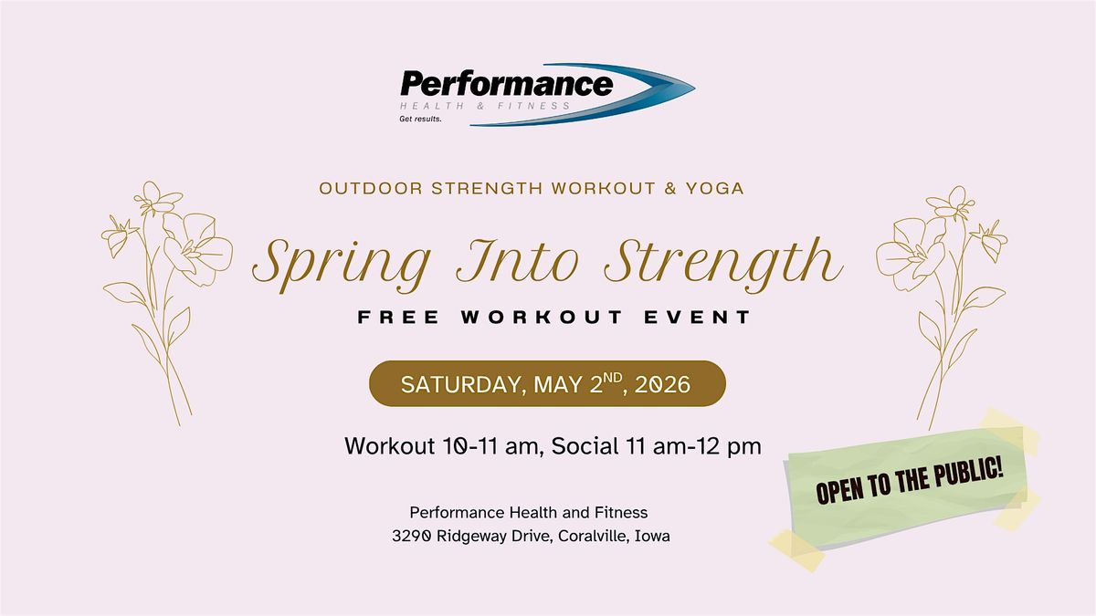 Spring Into Strength is a fun, energizing outdoor event at Performance Health and Fitness on Saturday, May 2nd from 10β11 AM. Start with a 30-minute strength workout to build power and confidence, then flow into a 30-minute yoga session to stretch and recover. Stick around after for a relaxed social hour to connect with others in the community. This event is free and open to the public. Bring a friend and enjoy a great morning outside! Sign up is free but required!