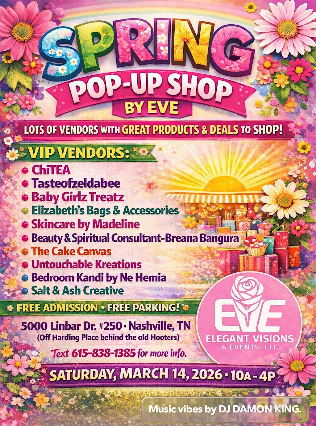 Get ready for an exciting shopping experience at our SPRING POP-UP EVENT by EVE (Elegant Visions & Events, LLC) at 5000 Linbar Dr, Ste 250-Nashville, TN! Mark your calendars for Saturday, March 14, 2026, at 10:00 AM (Central Time), because you won't want to miss this!