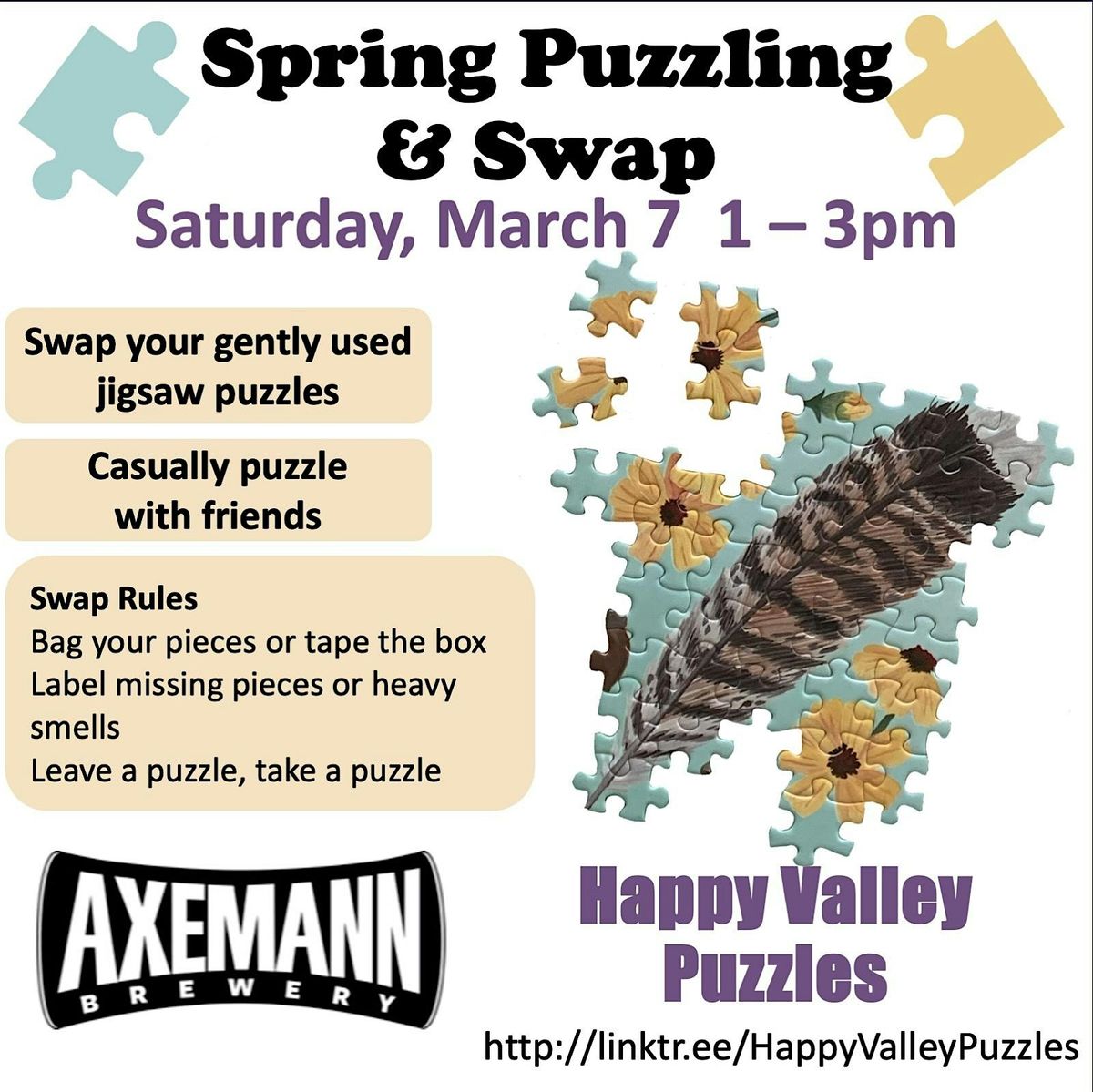 For the swap, please bag your pieces and/or tape your puzzle box. Label puzzles with missing pieces and/or heavy smells/smoke. Leave a puzzle on the table and take as many as you brought.