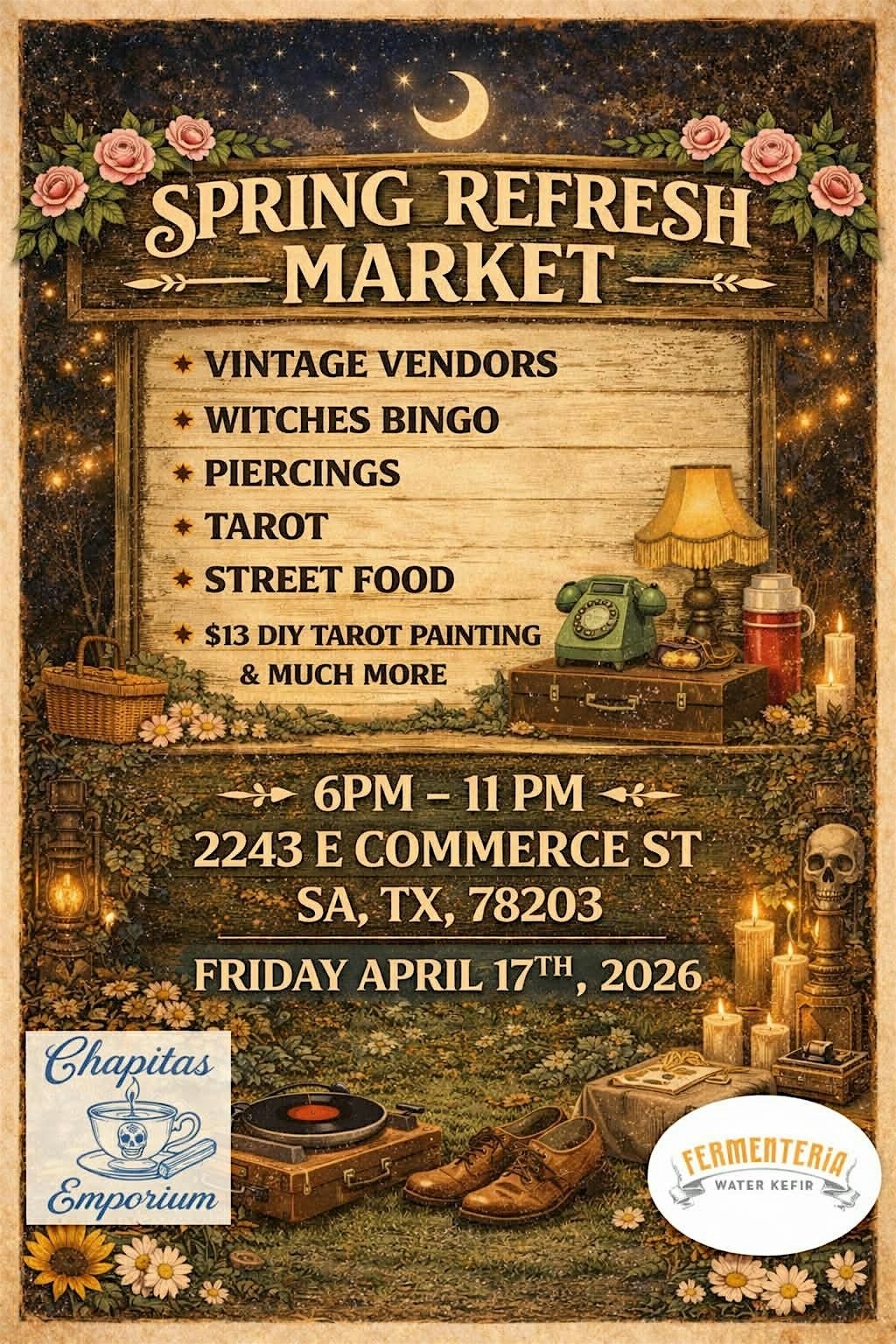 Our Spring Night Market invites you into an ethereal wonderland filled with vintage treasures, mystical experiences, and late-night indulgence. Wander through a curated collection of vintage vendors offering timeless pieces with stories to tell, then test your luck at Witches Bingo—where charms, chance, and a little chaos collide.