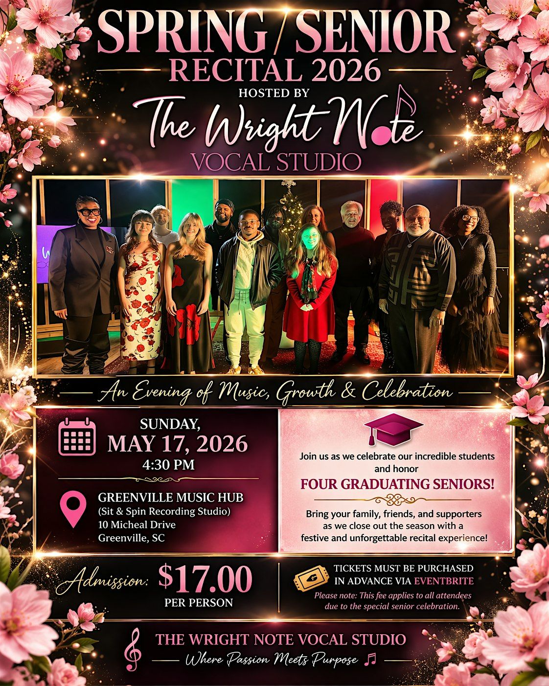 #TheWrightNoteVocalStudio #SpringRecital2026 #SeniorRecital #SupportTheArts #YoungArtists #LiveMusicGreenville #GreenvilleSCEvents #VocalExcellence #MusicWithPurpose #JamieWrightTheArtist #StudentShowcase #CelebrateTheJourney