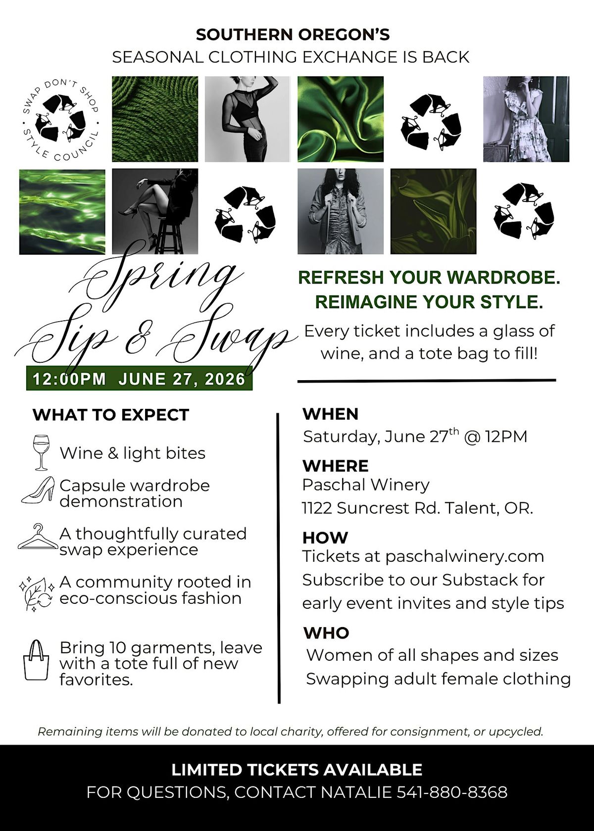 Enjoy wine & light bites at the beautiful Paschal Winery in Talent Oregon, all while refreshing your wardrobe in the company of like minded women.
