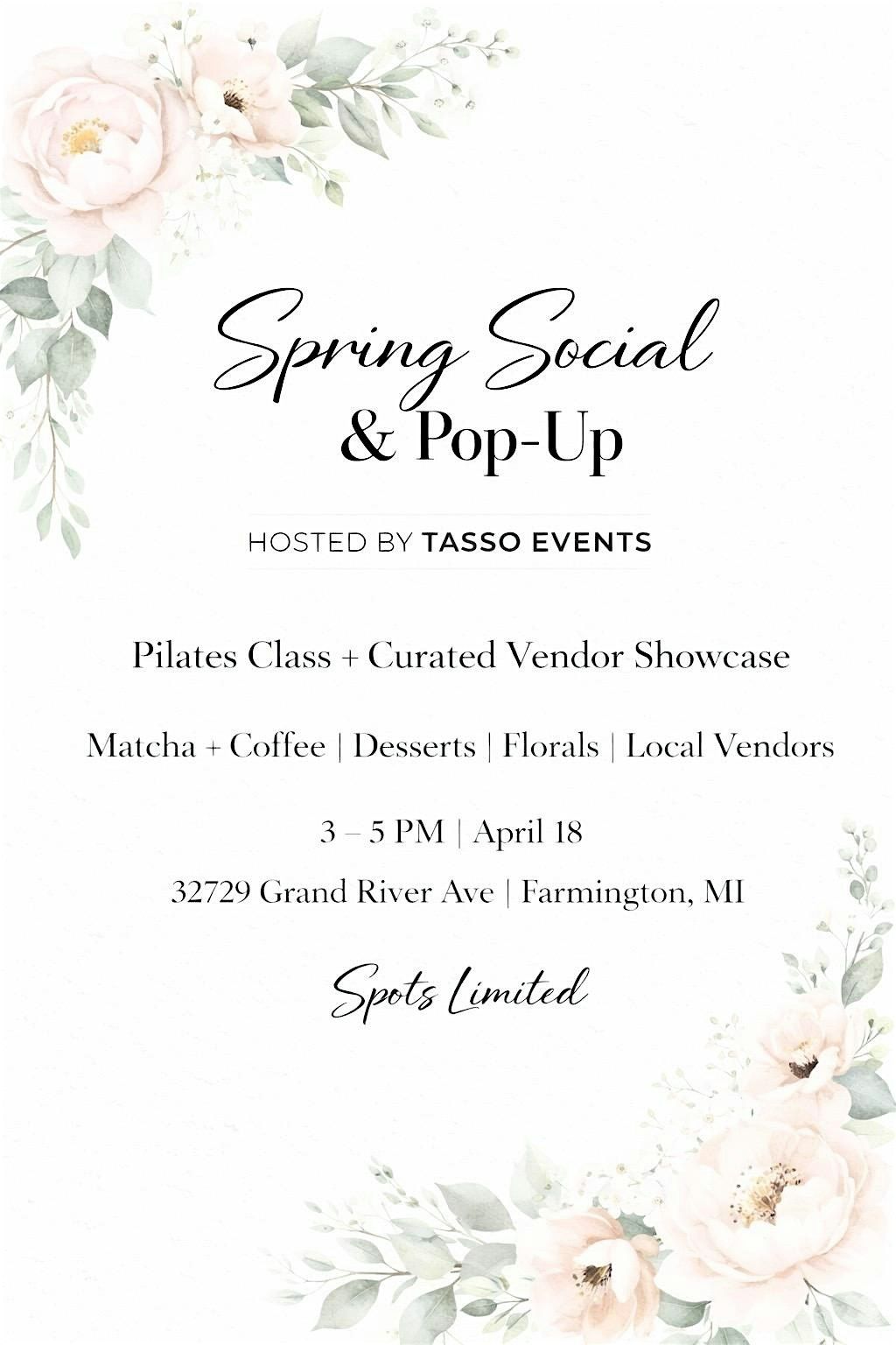 Join us for a spring Pilates class followed by a curated vendor pop-up experience hosted by Tasso Events.