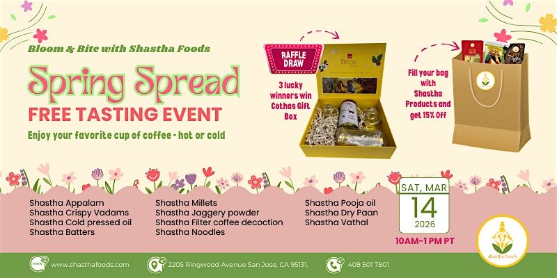 Join us for a free tasting event on March 14, 2026, 10AM to 1PM and enjoy your favorite cup of coffee - hot or cold from Shastha Foods at 2205 Ringwood Avenue San Jose, CA 95131.