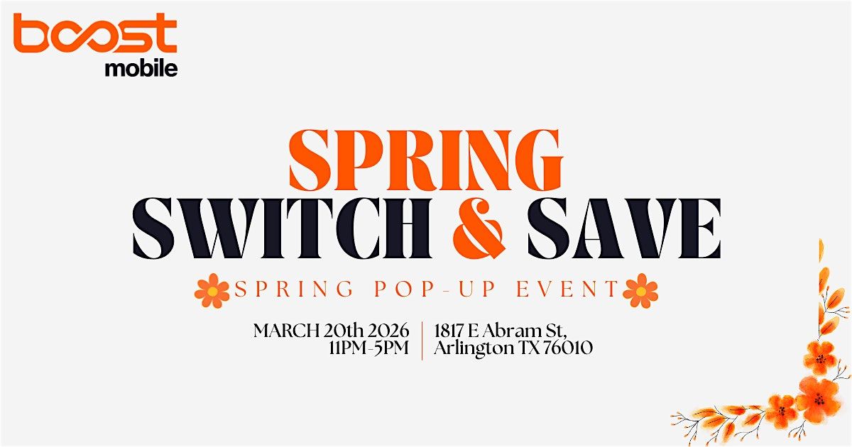 Hey there! 🌼 Join us in person for the Spring Switch & Save Pop-Up Event! It's your chance to discover awesome deals, switch to Boost Mobile, and save big all in one fun spot. Grab your friends, stop by, and catch some fantastic finds.