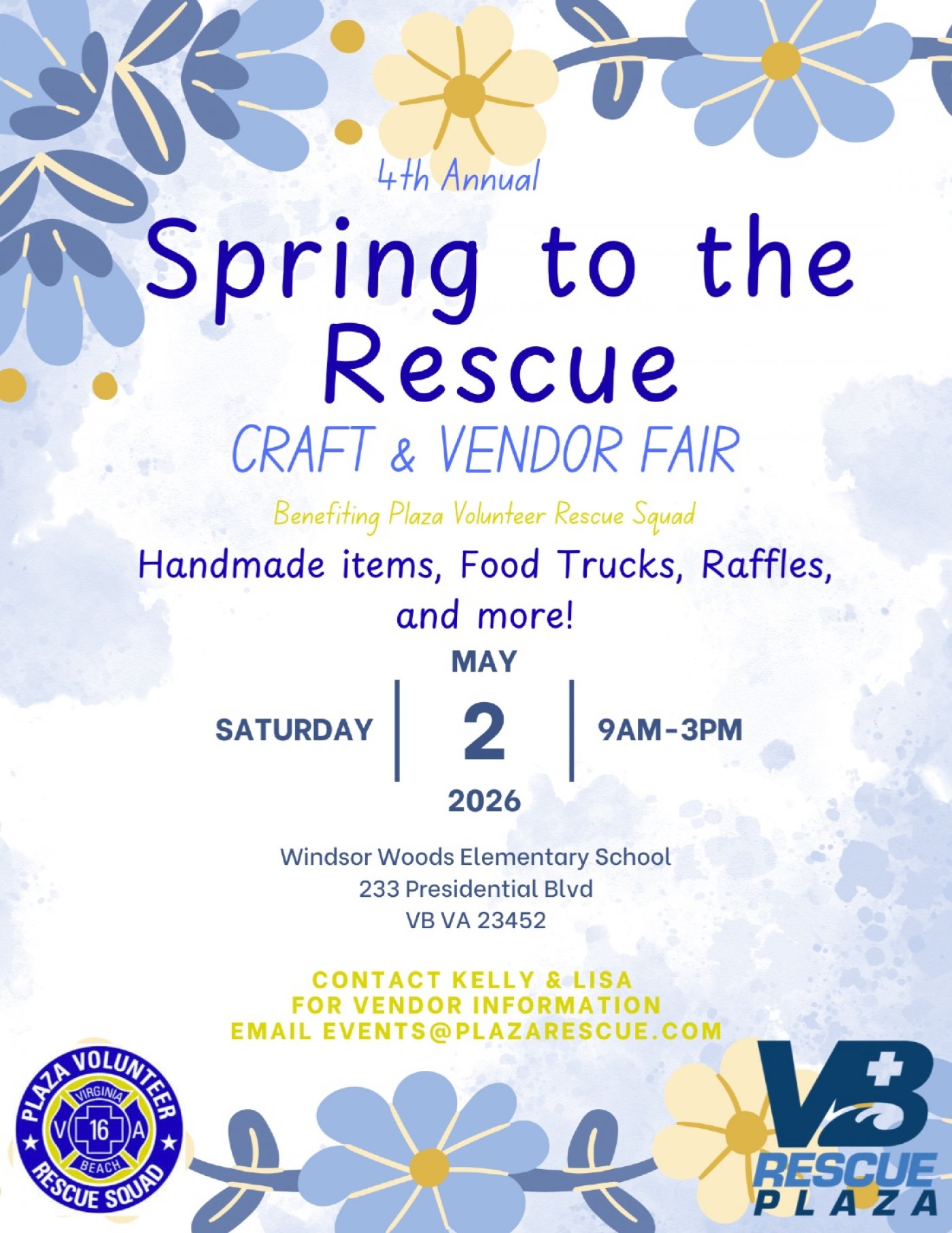 Plaza Volunteer Rescue Squad is holding our annual Spring to the Rescue Craft & Vendor fair! Come check out local artisans, small business owners, food trucks, and more! This year we are inside Windsor Woods Elementary school so RAIN OR SHINE!! Free and open to the public!