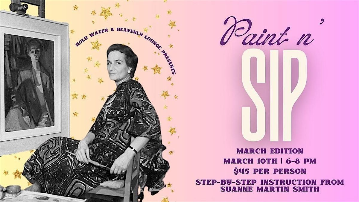 Welcome back to Holy Water's infamous Paint N' Sips! These events are 21+ only, occur monthly on Tuesdays and run from 6-8pm, with doors opening at 5:50 pm. Each ticket includes a complimentary drink, materials and a guided instructor from local artist, Suanne Martin Smith. Drinks and snacks are available for purchase!
