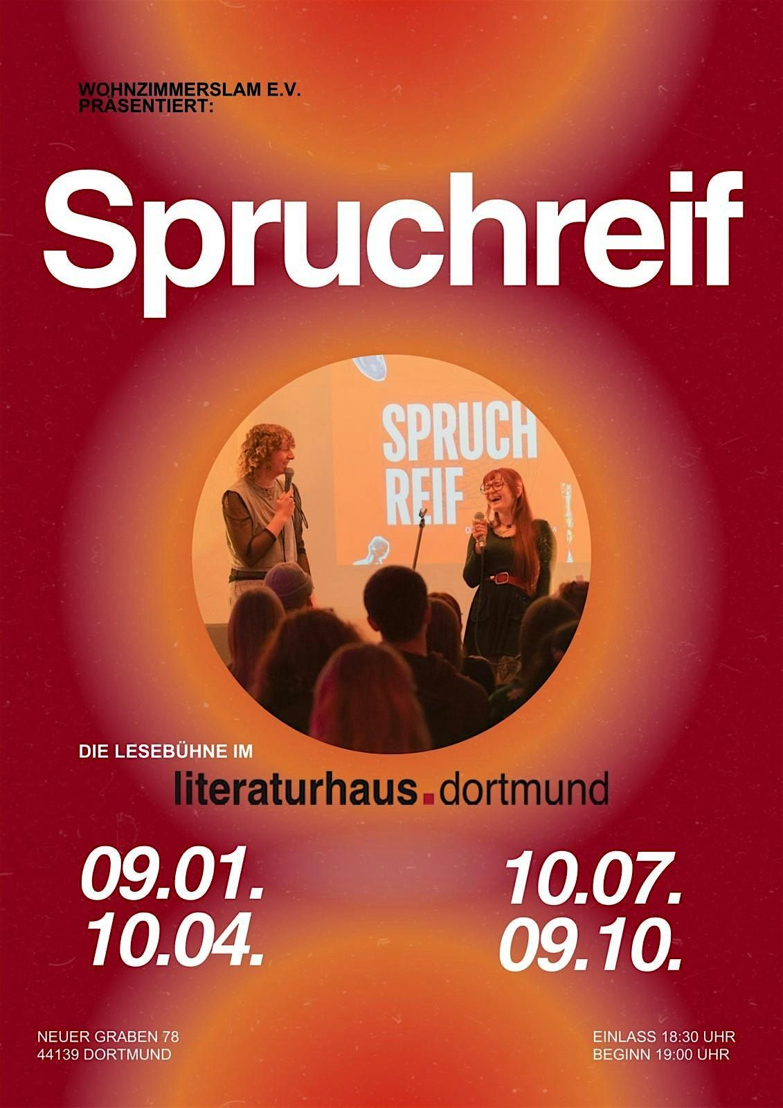 Spruchreif geht in die 2. Runde! Das Team im literaturhaus.dortmund freut sich auch dieses Jahr den Wohnzimmerslam e.V. und seine illustren Gäste im Neuen Graben 78 begrüßen zu dürfen. Ob auf der Bühne oder im Publikum: bei Spruchreif ist jede:r willkommen! Geboten wird eine literarische Wundertüte mit Wohlfühl-Faktor. Ein gemütlicher Abend für alle, die Lust auf Kunst, Kultur und Interaktion ohne Konkurrenzdenken haben. Eine wunderbare Gelegenheit, neue Talente kennenzulernen, Bühnenerfahrung zu sammeln und gemeinsam beherzt zu improvisieren.