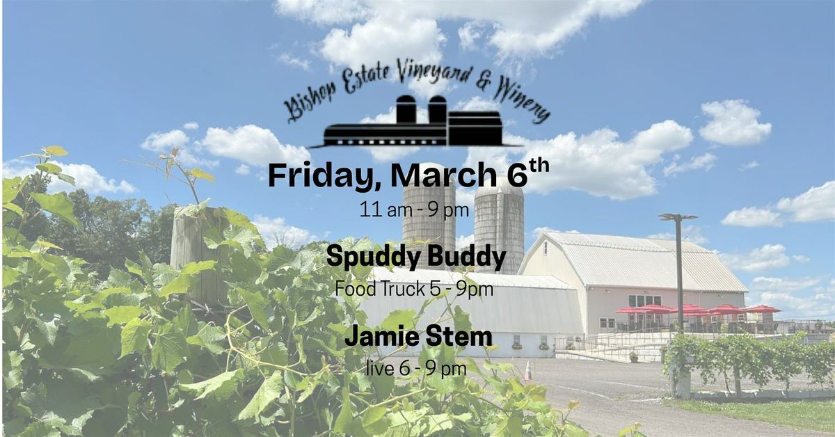 Come out to Bishop Estate Vineyard and Winery and enjoy some live music on Friday evening. Jamie Stem will be playing acoustic from 6-9 pm. We will have Spuddy Buddy Fry Factory Food Truck on site from 5-9 pm if you want to grab a bite to eat to enjoy with your wine!