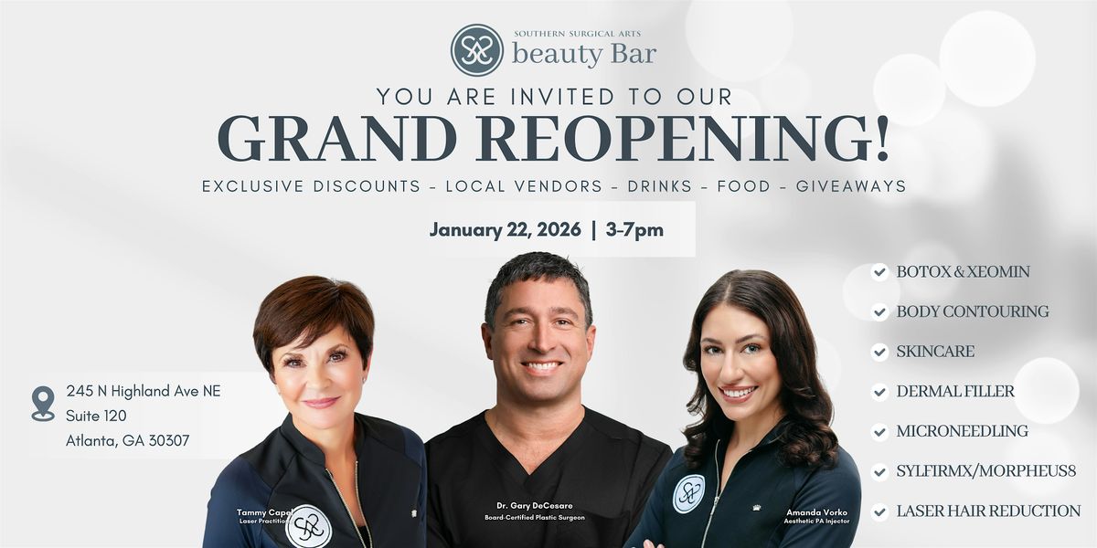 We’re opening our doors and welcoming you to a refreshed Southern Surgical Arts Beauty Bar, a luxury medical spa in Inman Park.
