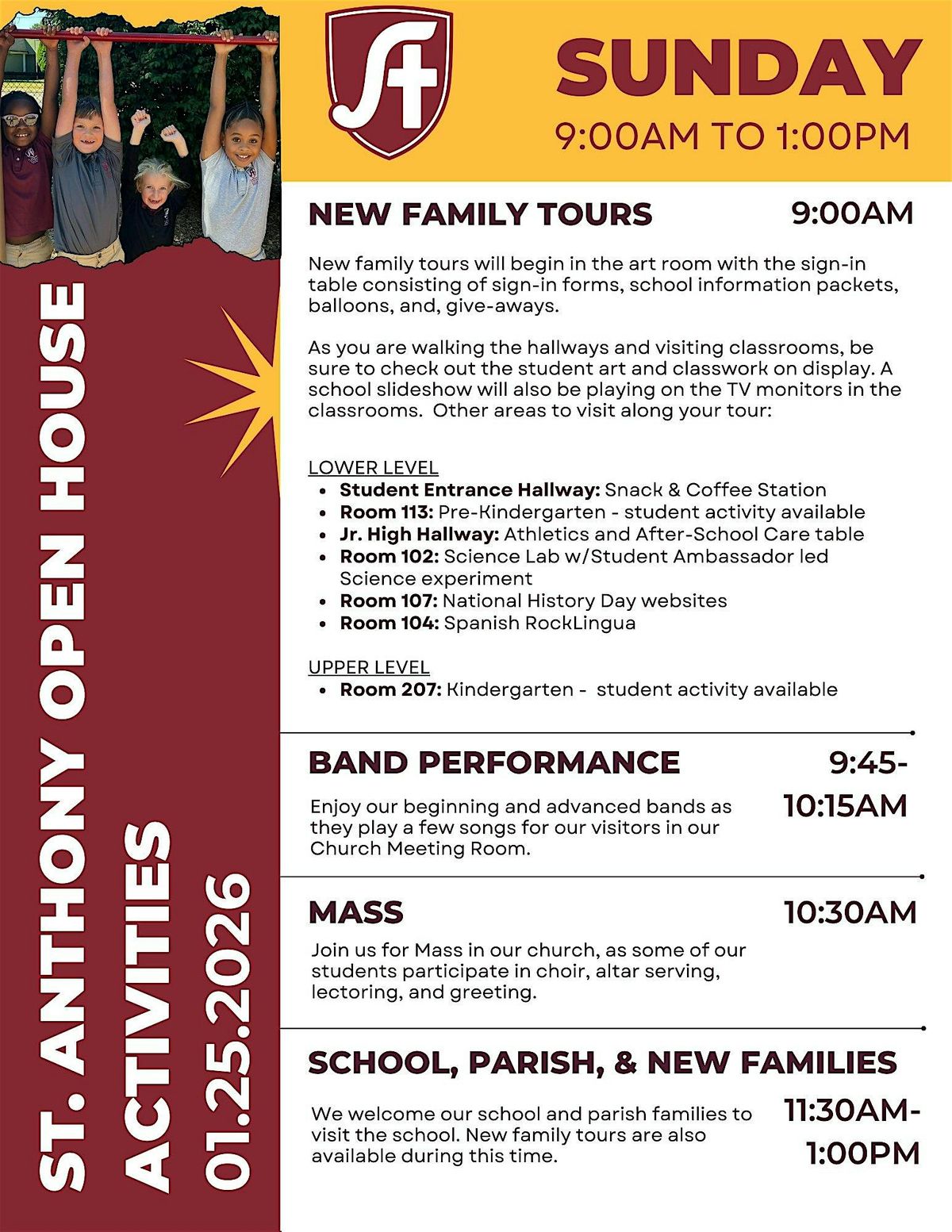 Learn more about St. Anthony de Padua Catholic School at our Open House on January 25, 2026! Take a tour of our school, see our band perform, and learn more about the Catholic education we offer at St. Anthony! Find more information at https://www.school.stasb.org/application