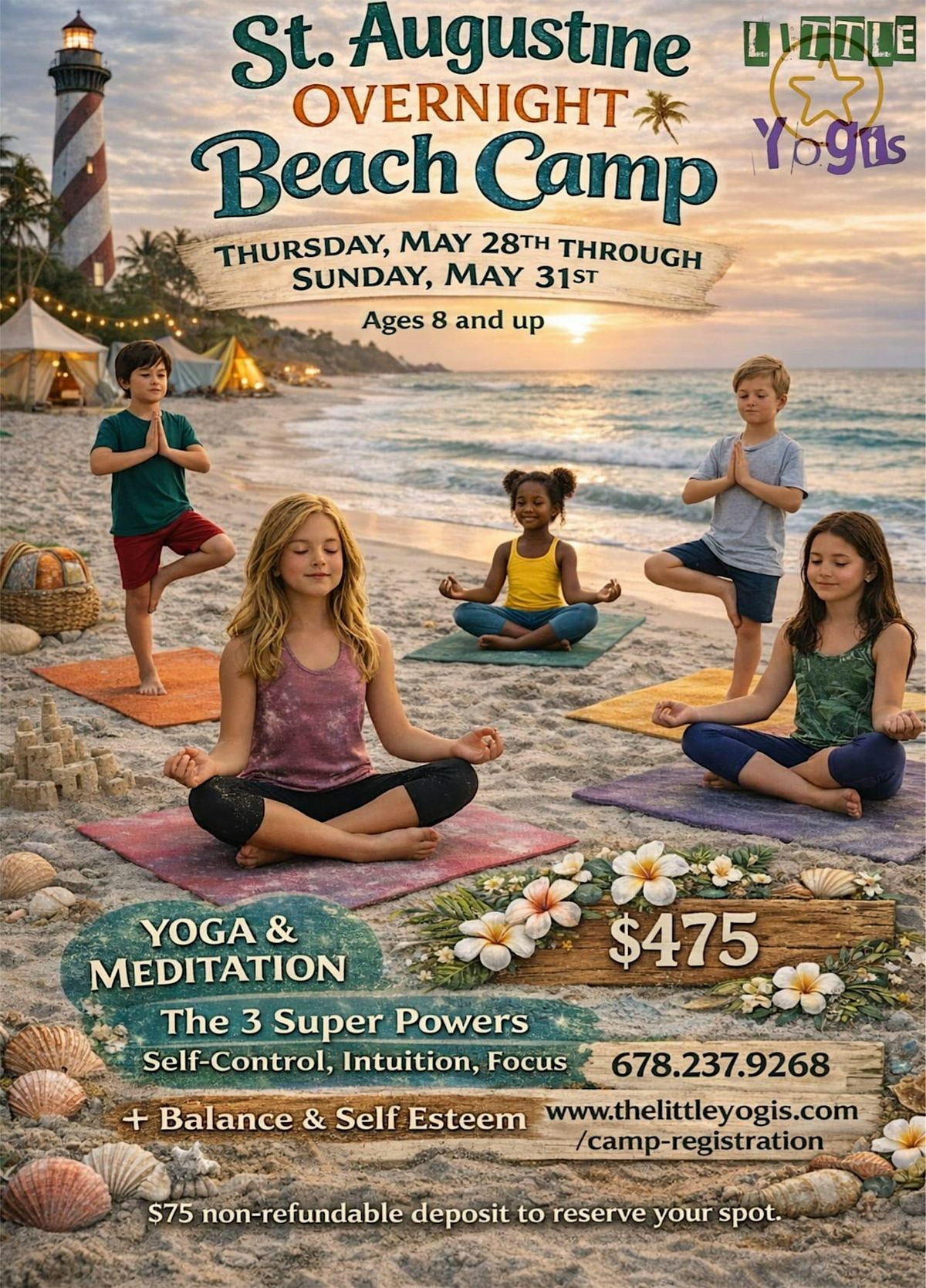 Ready for an awesome overnight adventure? Join us on a road trip to St. Augustine Beach Camp for a fun-filled, in-person camping experience right by the waves. Gather around the campfire and make some unforgettable memories under the stars. Yoga and meditation; 3 Super Powers - Self- Control, Intuition , Focus.