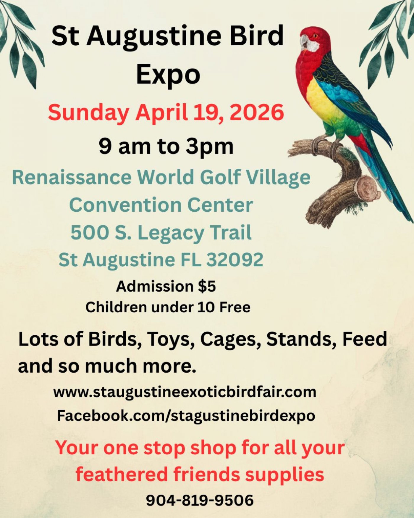 Step into a world of enchanting feathers and melodic chirps at the St Augustine Bird Expo. Join us on April 19th, 2026, at 09:00 AM at the picturesque World Golf Village Renaissance St. Augustine Resort.
