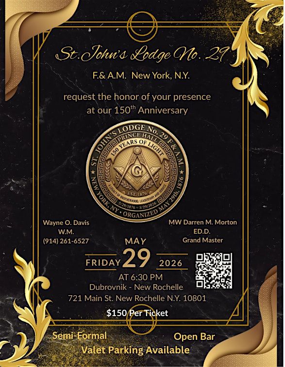 Join us in person for the St. John's Lodge o. 29 150th Anniversary Dinner! This special evening is all about honoring 150 years of tradition, friendship, and community. Come enjoy great company, delicious food, and a night full of memories. Don't miss out on this milestone celebration—let's make it one to remember!