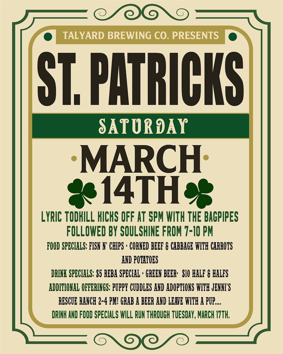 Lyric Todkill kicks things off at 5 PM with the bagpipes, followed by SOULSHINE from 7–10 PM.