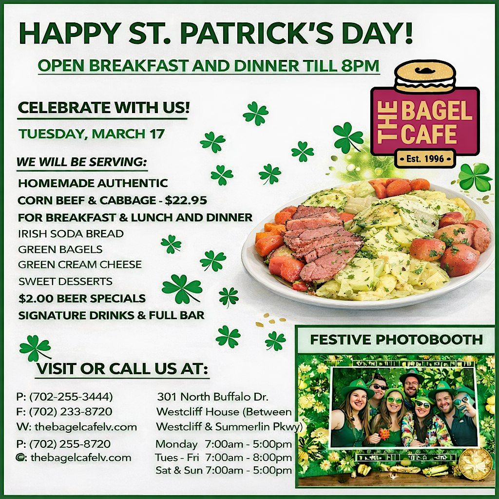 Come celebrate St Paddy's Day with us in person at The Bagel Cafe! Enjoy a fun, laid-back atmosphere filled with good vibes and great company. Whether you’re Irish or just Irish-at-heart, this is the spot to be for tasty treats and festive cheer. Don't miss out—grab your friends and join the party!
