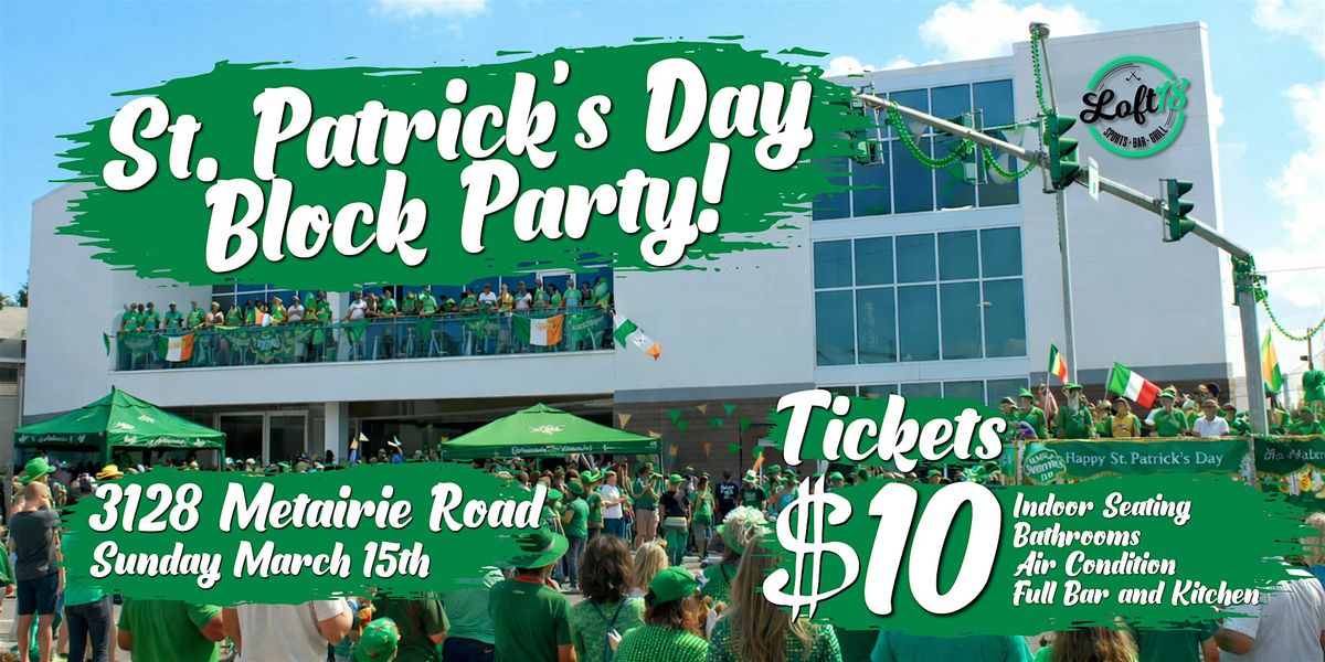 Come join us for a festive celebration at LOFT18 Metairie (3128 Metairie Rd. Metairie, LA 70001) located on the parade route. Get ready to enjoy a day filled with music, dancing, food, and fun! Wear your greenest outfit and get into the St. Patrick's Day spirit. Let's make this St. Paddy's Day one to remember!