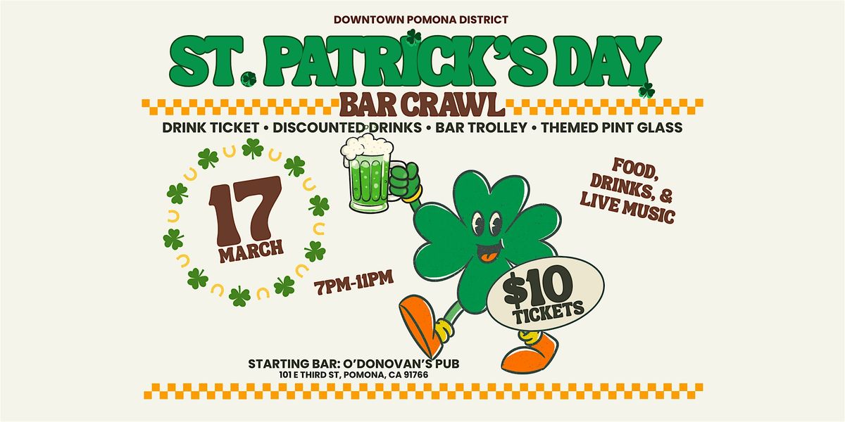 Join us for the Downtown Pomona District St. Patrick’s Day Bar Crawl, where participants will hop between some of the best bars in Downtown Pomona while enjoying drink specials, music, and the lively St. Patrick’s Day atmosphere.