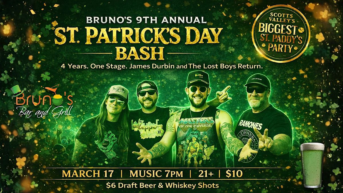 Join us at Bruno’s Bar & Grill in Scotts Valley for our 9th Annual St. Patrick’s Day Bash on March 17. This annual tradition has become one of the most anticipated St. Patrick’s Day celebrations in Santa Cruz County — and for the fourth consecutive year, James Durbin and The Lost Boys return to headline the night.