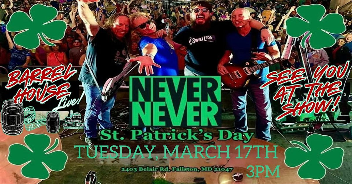 Never Never is taking the stage at Barrel House Live in Fallston on St. Patrick's Day, March 17th at 3pm in the Concert Hall! Don't miss out on the awsome tunes and vibes!Mark your calendars, grab your green attire, and we'll see ya there!
